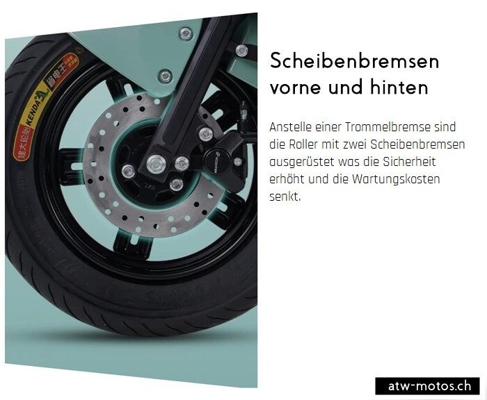 Anstelle einer Trommelbremse sind die Roller mit zwei Scheibenbremsen ausgerüstet was die Sicherheit erhöht und die Wartungskosten senkt.