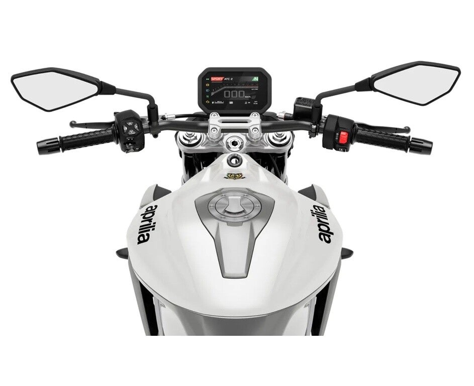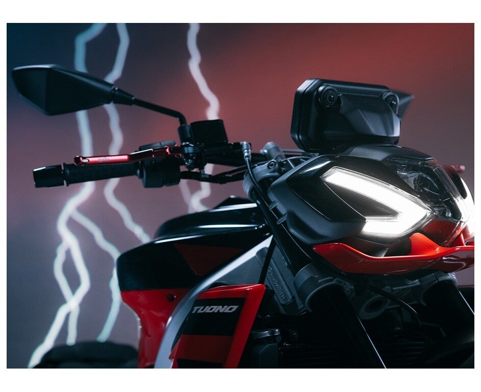 Das Design der Tuono 457 entstand von Grund auf neu mit wesentlichen Merkmalen, die sich perfekt in die kompakten Flächen integrieren: von der Full-LED mit dem dreiteiligen Scheinwerfer, über einem kleinen Spoiler, der von der Tuono 1000 R inspiriert ist, bis hin zum Tank, der für eine optimale Ergonomie beim Fahren in aufrechter Position entworfen wurde.