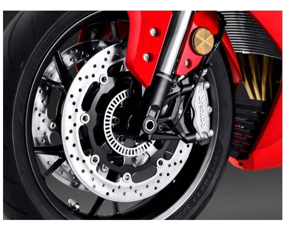 Die QJMotor SRK 800RR setzt auf High-End-Fahrwerkstechnik für maximale Kontrolle und Fahrfreude. Vorne sorgt eine Marzocchi Upside-Down-Gabel für präzise Rückmeldung und individuell einstellbaren Federkomfort, während hinten ein hydraulischer Monoshock Stabilität, Agilität und Reaktionsschnelligkeit garantiert. Die radial montierten Brembo-Bremssättel in Kombination mit der doppelten 320 mm-Scheibe liefern eine beeindruckende Bremskraft, die jederzeit souverän dosierbar ist – für volle Kontrolle, sportliche Präzision und ein sicheres Fahrgefühl auf allen Straßen.
