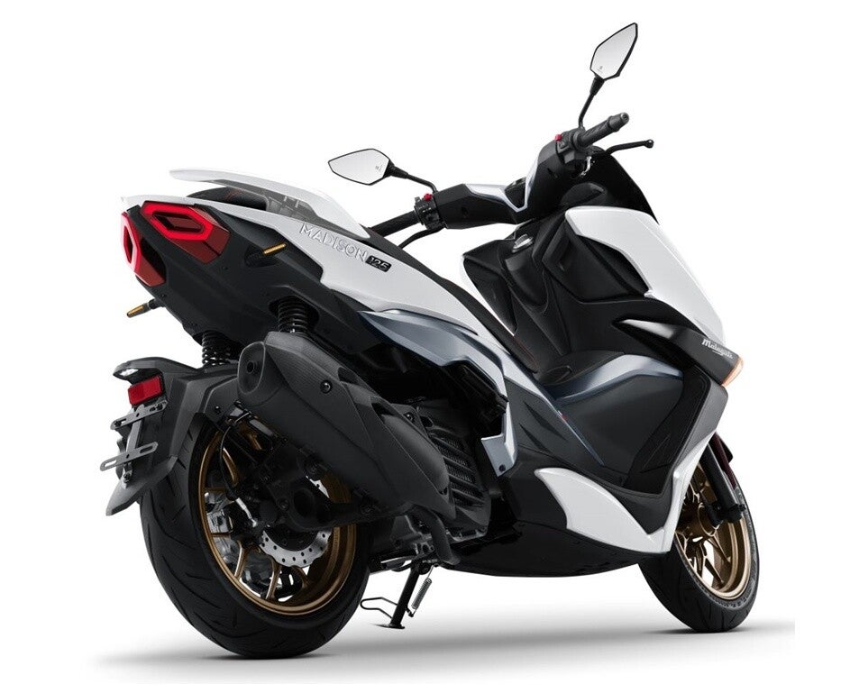 Die Madison 125 besticht durch ihr italienisch‑geprägtes Design: klare Linien, stimmige Proportionen und hochwertige LED‑Beleuchtung – vorne LED‑Scheinwerfer mit integriertem Tagfahrlicht, sowie LED‑Blinker, Heck‑ und Rücklicht.